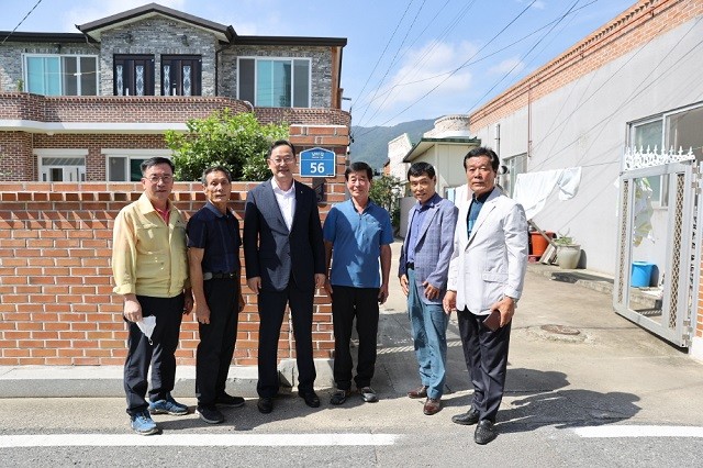 | ▲ 명현관 해남군수(좌측부터 세 번째)가 14일 제75주년 광복절을 앞두고 김천수 월남참전 유공자 가정에 명패를 부착 한 후 관계자들과 함께기념촬영을 하고 있다. / 해남군 제공 |