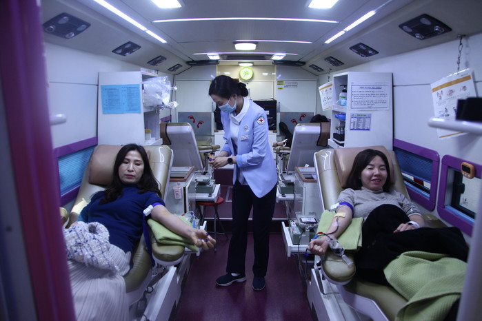 경기 수원시 팔달구에서 14일 코로나19(우한폐렴)로 인한 혈액 수급난에 도움이 되고자 구청 직원들이 자발적으로 헌혈 운동에 동참했다. 이날 50여명의 직원은 구청 주차장에 마련된 헌혈버스에서 헌혈을 했다. 사진은 직원들이 헌혈하는 모습. (사진제공=팔달구청)