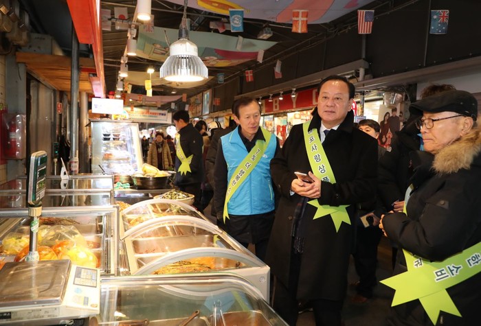 유동균 서울 마포구청장이 16일 다가오는 설을 맞이해 지역내 아현시장을 방문해 지역 소비 촉진과 소상공인 매출 증대를 위해 발행한 마포사랑상품권을 홍보하고 상인들에게 격려의 말을 건넸다. 사진은 시장을 둘러보는 유 구청장의 모습. (사진제공=마포구청)