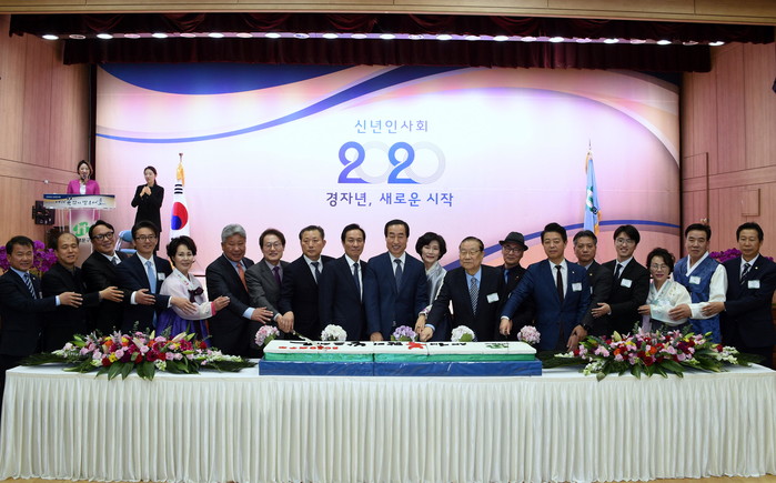 서울 서대문구가 16일 구청 대강당에서 주민과 직능단체 대표, 각계 인사 등 2000여명이 참석한 가운데 '신년인사회'를 열고 '지속가능한 미래지향도시' 구현을 위한 의지를 다졌다. 사진은 문석진 구청장(가운데)과 참석자들이 축하 시루떡을 자르는 모습. (사진제공=서대문구청)