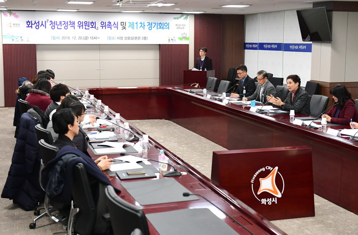 경기 화성시는 20일 시청 본관 2층 상황실에서 서철모 시장, 청년정책위원회 위원 등 20여명이 참석한 가운데 '화성시 청년정책위원회' 위촉식 및 1차 정기회의를 개최했다. 사진은 서 시장 및 청년정책위원들이 회의를 하고 있는 모습.(사진제공=화성시청)