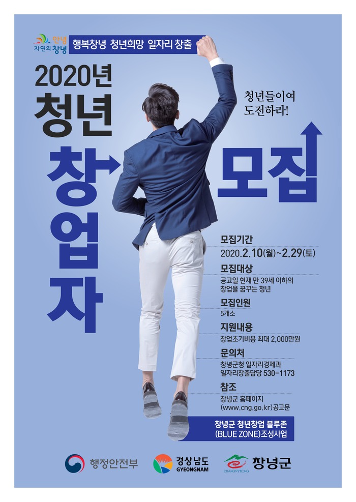 청년창업 블루존(Blue-Zone) 조성사업은 다양한 아이디어와 재능을 가진 청년들을 창녕으로 유입하여 청년 소상공인으로 양성하고 나아가 지역사회에 공헌할 수 있는 사회적 기업가로 유도하기 위해 올해 처음 시도해보는 사업이다