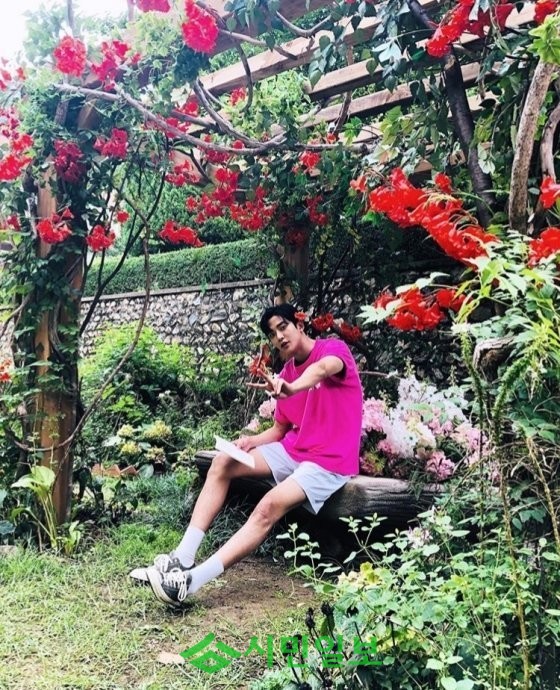 공개된 사진 속 로운은 화사한 꽃들 아래에 앉아 남다른 기럭지를 뽐내고 있다.