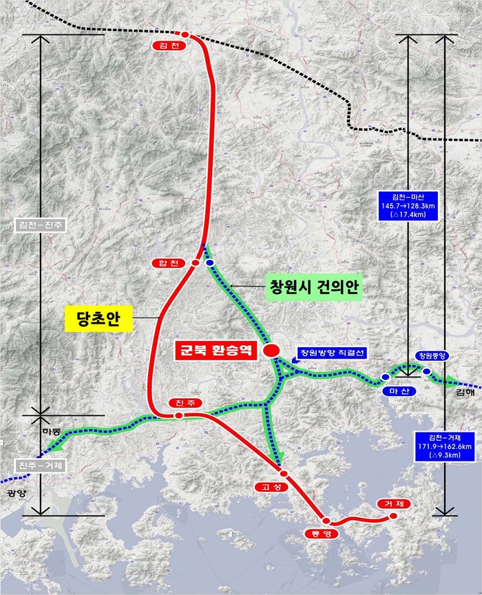 이와 관련 창원시가 국토부에 건의한 안은 김천에서 합천, 함안 군북역을 경유하여 고성‧통영‧거제로 연결하는 직선화 방안이 골자이다. 창원시는 이번 수정노선이 기존 진주방향 노선보다 서울-거제 간 운행거리는 10km, 서울-마산역 기준 소요 시간은 20분가량 단축시킬 수 있으며 소요 사업비 또한 2000억 원을 절감할 수 있다는 전문 용역업체의 분석 데이터를 바탕으로 국토부에 적극 건의하고 있다.