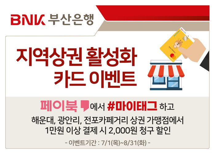 [시민일보 = 여영준 기자] BNK부산은행은 오는 8월31일까지 코로나19등으로 인한 매출감소로 어려움을 겪고 있는 지역 소상공인을 위해 ‘지역상권 활성화 카드 이벤트’를 진행한다.
