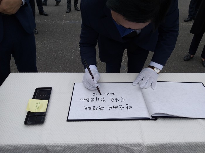 이날 김 후보는 방명록에 “반란에서 항쟁으로 진실을 밝히겠습니다”라는 글을 남겼다.
