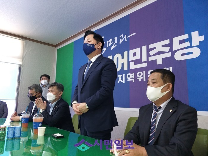 | ▲ 왼쪽부터 두 번째 서동용 의원, 가운데 김두관 후보, 유시문 구례군의장 김두관 후보가 민주당 지지호소를 하고 있다.(사진=김민재 기자) |