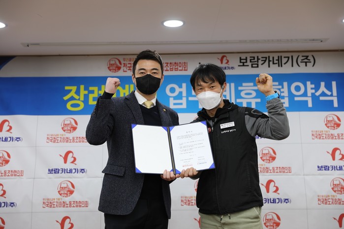 | ▲ 김경곤 보람카네기㈜ 영업이사(왼쪽)와 강효찬 전국철도지하철노동조합협의회 집행위원장(오른쪽)이 협약 체결 후 기념 사진을 촬영하고 있다.(사진제공=보람상조) |