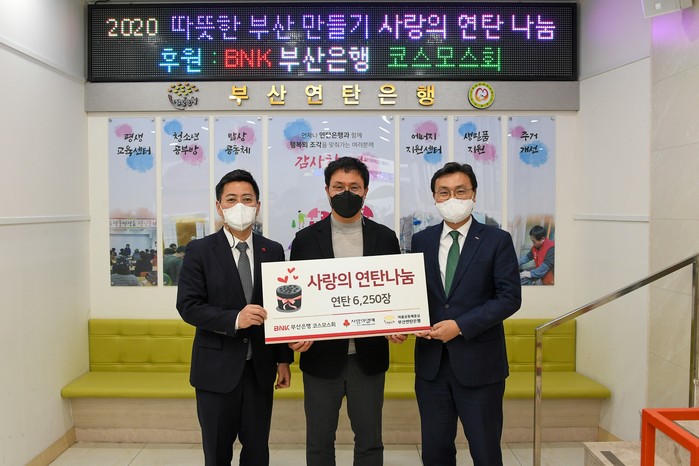 부산은행 코스모스회 관계자는 “코로나19등 여파로 연탄기부가 전년대비 크게 줄었다는 안타까운 소식을 전해들었다”며 “넉넉하진 않지만 부산은행 임직원들의 작은 정성이 지역의 어려운 이웃들의 따뜻한 겨울나기에 도움이 되길 바란다”고 전했다.