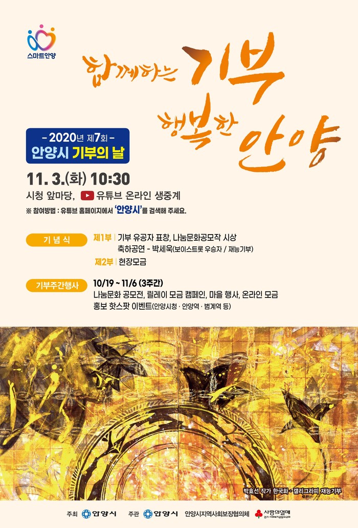 2020년도 경기도 안양시 기부의 날 기념행사‘함께하는 기부, 행복한 안양’이 10월 19일부터 11월 6일까지 3주 동안 안양시 관내에서 펼쳐진다.
