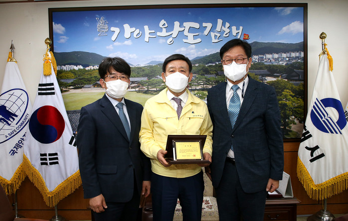 허성곤 김해시장이 남해고속도로 진영(부산)복합휴게소 건설공사에 기여한 공로를 인정받아 26일 한국도로공사(사장 김진숙)로부터 감사패를 전달받았다.