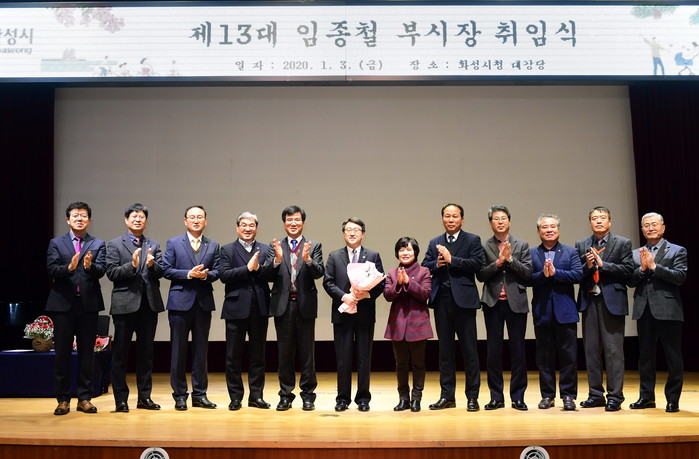 최근 임종철 경기 화성시 부시장이 시청 대강당에서 취임식을 한 후 본격 업무에 들어갔다. 임 부시장은 취임식에서 “‘기분좋은 변화, 행복 화성’을 건설할 수 있도록 노력하겠다”고 말했다. 사진은 취임을 축하하며 함께 기념촬영을 하는 모습.(사진제공=화성시청)