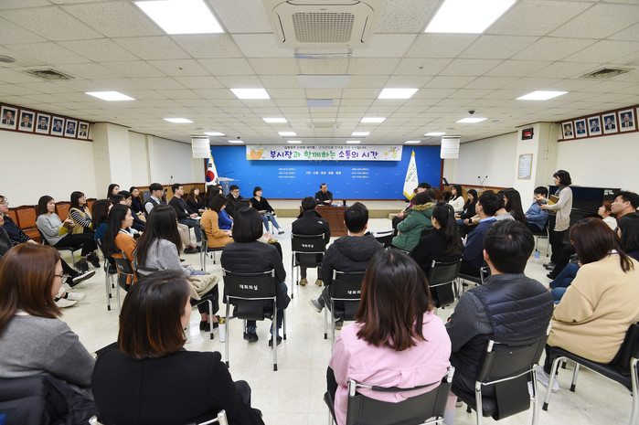 조학수 경기 양주시 부시장은 최근 시청 대회의실에서 각 부서의 통로 역할을 수행하는 서무·회계 담당직원들과 함께 소통의 시간을 보냈다. 사진은 조 부시장과 직원들이 이야기를 나누고 있는 모습.(사진제공=양주시청)
