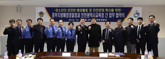 인천시교육청과 중부지방해양경찰청이 23일 중부지방해양경찰청 회의실에서 청소년의 안전한 해양활동 지원 및 해양 안전문화 확산을 위한 업무협약을 체결했다. 사진은 업무협약을 체결한 후 기념촬영을 하고 있는 관계자들의 모습.(사진제공=인천시교육청)