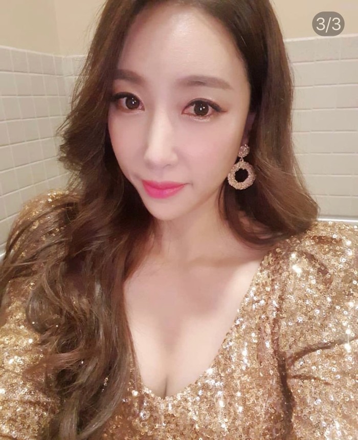 공개된 사진 속 숙행은 금색 의상을 입고 웃으며 카메라를 쳐다보고 있다.