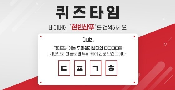 현빈샴푸 초성퀴즈 이벤트는 "닥터포헤어는 두피관리센터의 'ㄷㅍㄱㅎ'을 기반으로 한 글로벌 두피케어 전문 브랜드이다. 빈칸에 들어갈 말은?" 이 문제로 나왔다.