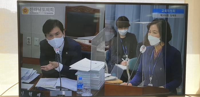 | ▲ 전남도의회 이혁제 의원이 21년 행정사무감사장에서 전남도교육청 교육정보원장을 상대로 질의를 하고 있다.(출처=전남도청 중계용 모니터) |