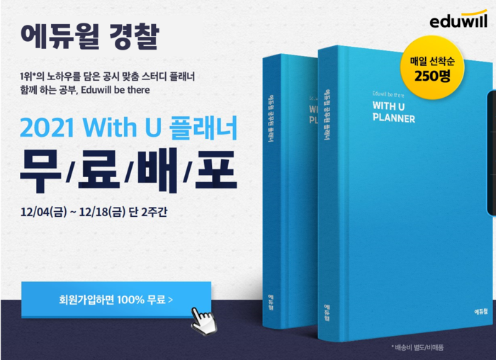에듀윌 경찰의 스터디 플래너는 지난 4일 이후 신규 회원이면 누구나 신청할 수 있다. 오는 18일까지 단 2주간만 진행하는 ‘2021 위드유 플래너’ 무료 증정 이벤트에 대한 자세한 사항은 에듀윌 경찰 홈페이지를 통해 확인할 수 있다.