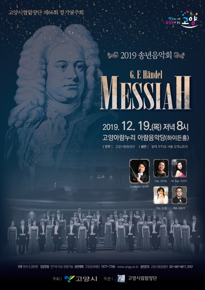 [고양=이기홍 기자] 다채로운 공연과 연주로 문화예술도시로서 고양시의 위상을 높이고 있는 고양시립합창단이 제66회 정기연주회, ‘송년음악회, 헨델 메시아’를 오는 12월 19일 저녁 8시에 고양아람누리 아람음악당(하이든홀)에서 개최한다. 고양시립합창단, 4인의 솔리스트, 알테 무지크 서울의 연주로 연말의 기쁨을 함께하는 웅장한 무대가 펼쳐질 예정이다.