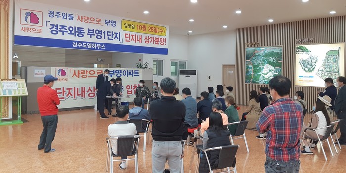 | ▲ 지난 28일 경주 외동 사랑으로 부영 모델하우스에서 단지내 상가 분양 입찰을 진행하고 있다. (사진제공= 부영주택) |
