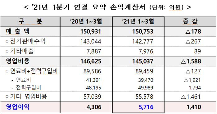 [시민일보 = 여영준 기자] 한국전력이 지난 14일 올해 1분기 연결기준 매출액 15조753억원, 영업이익 5716억원을 시현했다고 발표했다.