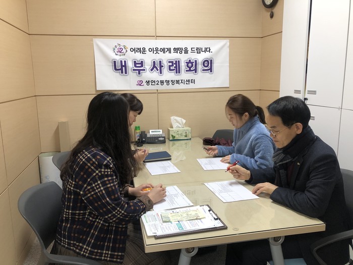 경기 동두천시 생연2동 맞춤형복지팀은 20일 생연2동장과 사례관리팀 전원이 참석한 가운데 맞춤형 복지서비스 지원을 위한 내부 사례회의를 실시했다. 사진은 관계자들이 회의하는 모습.(사진제공=동두천시청)