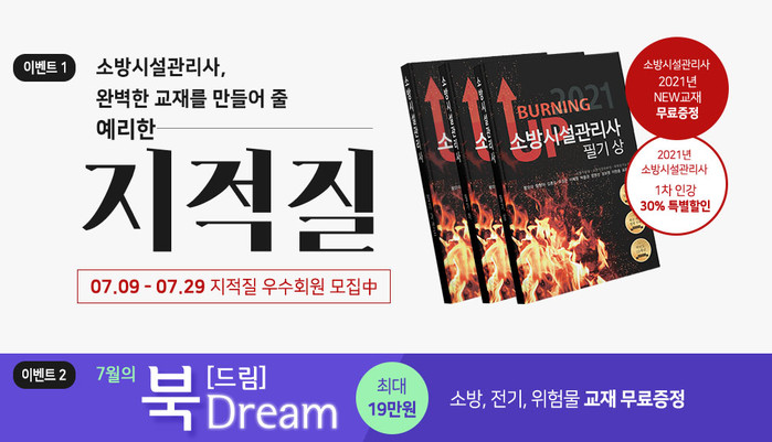 더불어 신 교재 출시 전 소방시설관리사 교재 정오표 이벤트 “지적질 우수 회원 모집” 을 7월8일 실시한다고 밝혔다. 소방시설관리사의 수험생이 해마다 늘어나고 있는 가운데 2021년 소방시설관리사 교재를 가장 빠르게 만나볼 수 있다는 점에서 많은 수험생들의 관심을 끌 것으로 예상된다.