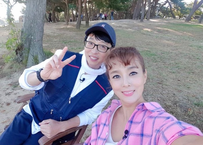 공개된 사진 속 김원희는 유재석과 활짝 웃으며 카메라를 쳐다보고 있는 모습이 담겨 있다.