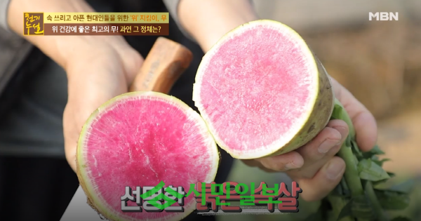 중국의 붉은 무를 개량해 만들었다는 수박무는 항산화 성분인 안토시아닌이 풍부하게 들어있어 붉은빛을 띤다고 하며, 노화 예방은 물론 콜레스테롤까지 배출, 다이어트에 도움이 된다고 한다.