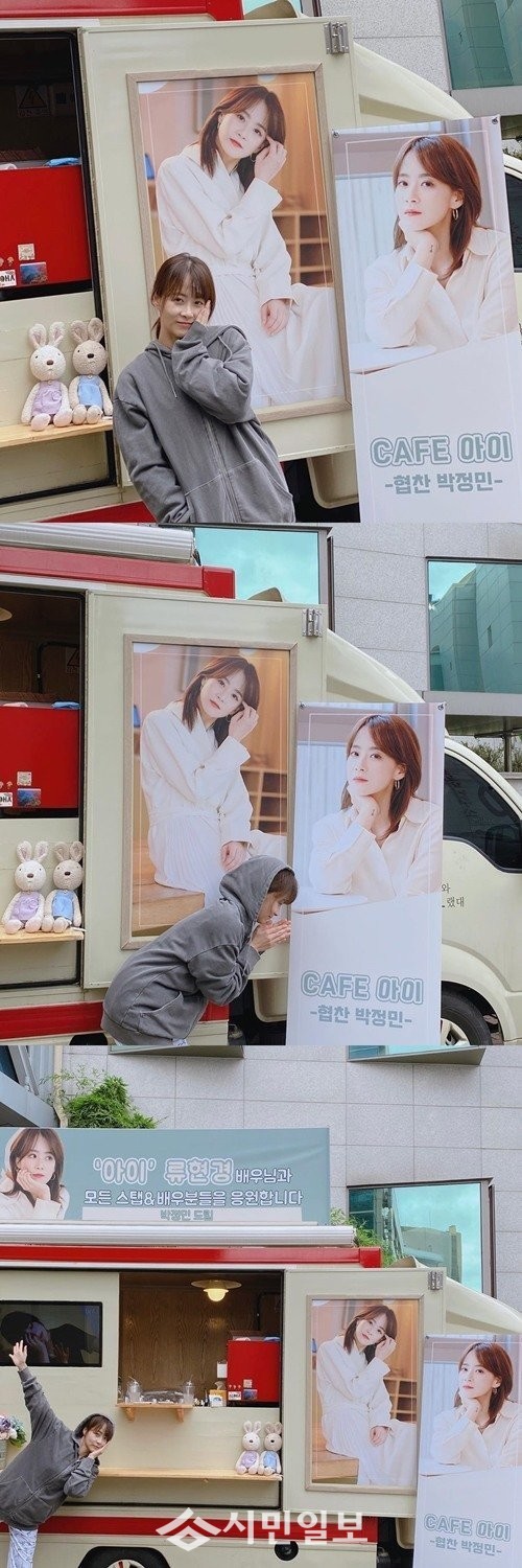 사진 속 류현경은 박정민이 영화 '아이'(가제) 촬영장에 보내준 커피차 앞에서 인증샷을 남기고 있는 모습으로 훈훈함을 자아냈다.