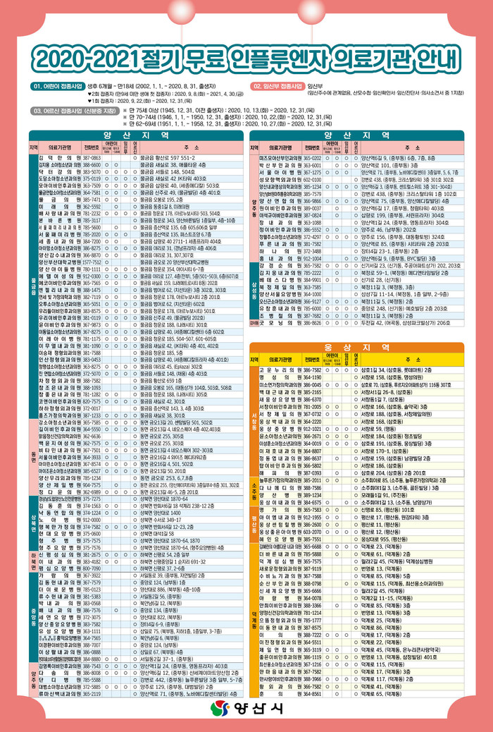 코로나19가 종식되지 않고 확진자가 지속적으로 발생하는 가운데 인플루엔자 유행 시기가 다가옴에 따라 양산시가 대대적인 인플루엔자 예방접종 홍보에 나섰다.