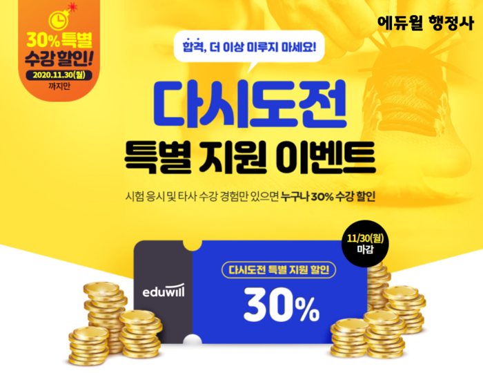 에듀윌 행정사 '다시도전 특별 지원 이벤트'는 시험 응시 및 타사 수강 경험이 있는 수험생이라면 누구에게나 30% 수강료 할인 혜택을 제공한다.