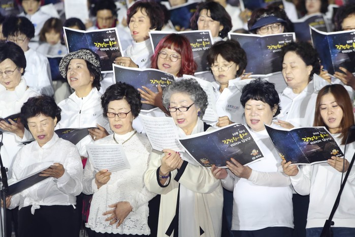 서울 관악구는 최근 '귀주대첩 1000주년'을 맞이해 서울과학전시관 광장에서 ‘2019 관악 강감찬 축제’를 개최했다. 이날 축제에서는 1000인 구민합창단이 강감찬 축제 주제곡 등을 합창했다. 사진은 구민합창단이 합창을 하고 있는 모습.(사진제공=관악구청)