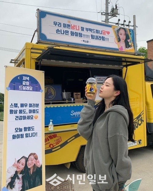 사진에는 박소담이 MBC 새 월화드라마 '저녁 같이 드실래요' 촬영장에 보내준 커피차 앞에서 화사한 미모를 뽐내고 있는 손나은의 모습이 담겨 훈훈함을 자아냈다.