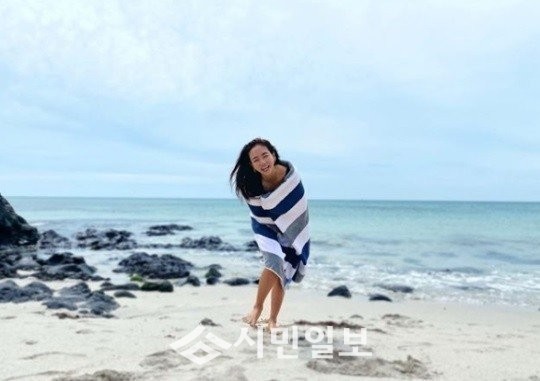 공개된 사진 속 진재영은 바닷가에서 담요를 둘러매고 환한 미소를 지으며 일상을 즐기는 모습으로 훈훈함을 자아냈다.