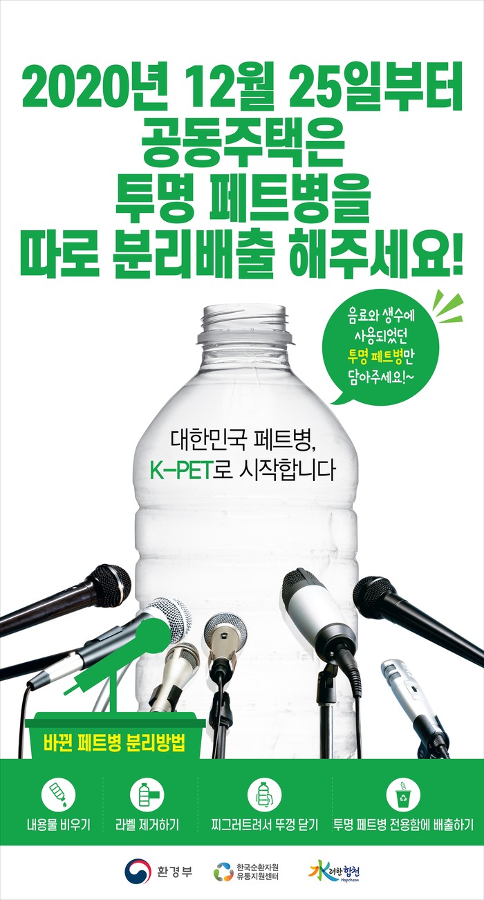 경남 합천군(군수 문준희)은 환경부의 ‘재활용 가능 자원의 분리수거 등에 관한 지침’ 개정으로 공동주택은 오는 25일부터 투명 페트병을 합성수지 용기류(플라스틱)와 구분하여 배출해야한다고 밝혔다.