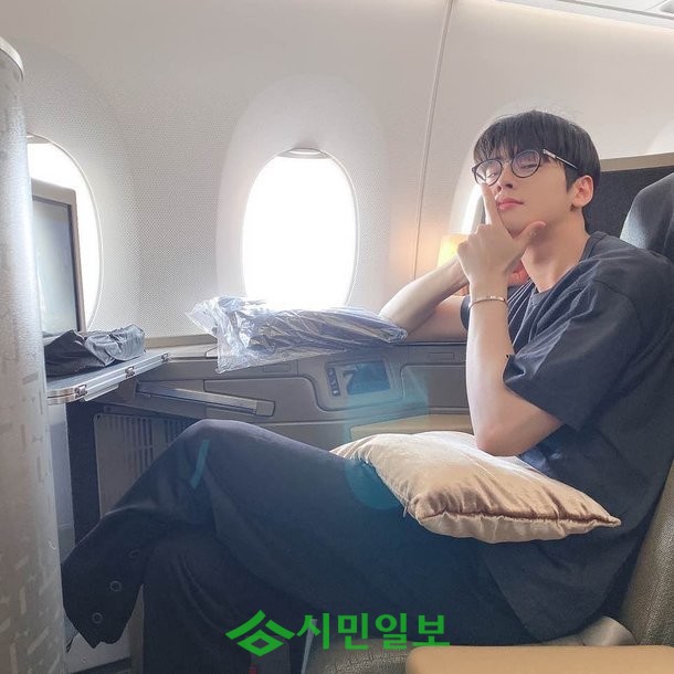 공개된 사진 속 차은우는 안경과 검은 티셔츠, 트레이닝 바지를 입고 기내에 앉아 있는 모습이다. 안경으로도 가려지지 않는 완벽한 조각 외모에 팬들의 눈길을 끈다.