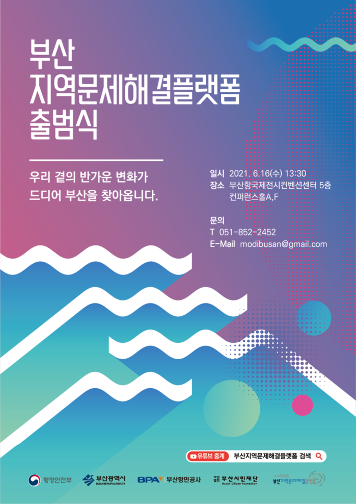 BPA는 16일 오후 1시 30분 부산항국제전시컨벤션센터 5층 컨퍼런스홀에서 부산광역시, 부산시민재단 등과 함께 「부산지역문제해결플랫폼」 출범식을 연다고 밝혔다.