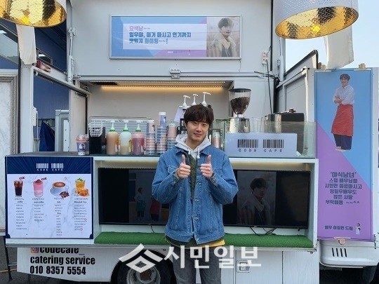 공개된 사진 속 정일우는 새 드라마 '야식남녀' 촬영 현장에 보내진 이정현의 커피차를 인증하며 양손으로 엄지를 치켜들며 감사한 마음을 표시해 훈훈함을 자아냈다.