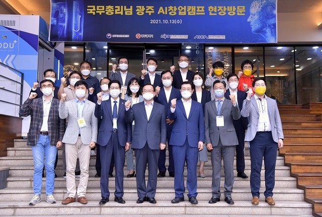 [광주=정찬남 기자] 김부겸 국무총리(앞줄 가운데)이용섭 광주광역시장이 13일 오후 동구 금남로 소재 광주AI창업캠프를 방문해 관계자들과 기념촬영을 하고 있다.