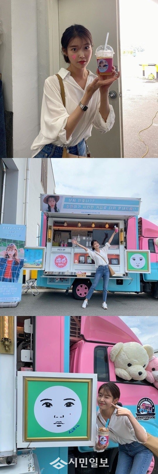 공개된 사진 속 아이유는 팬들이 선물한 음료를 들고 하트 애교를 선보이며 요정 미모와 함께 환한 미소를 드러내 훈훈함을 자아냈다.