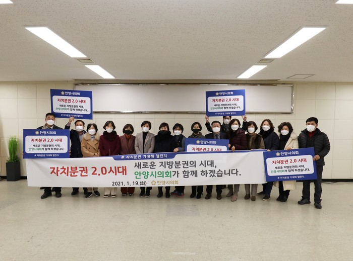 [안양=최휘경 기자] 경기도 안양시의회 의원들이 19일 지방분권 2.0시대 개막을 응원하기 위해 ‘새로운 지방분권의 시대, 안양시의회가 함께 하겠습니다’라는 구호와 함께 ‘지방분권 기대해 챌린지’에 동참했다.