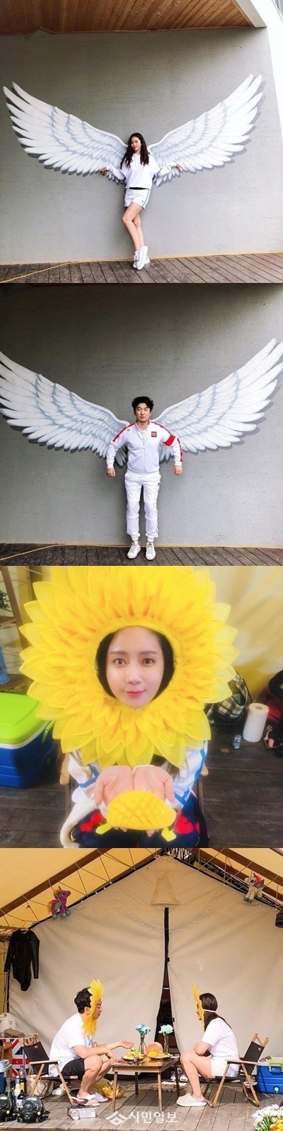 공개된 사진 속 최송현과 남자친구 이재한은 날개가 그려진 벽화앞에서 포즈를 취한 모습과 함께 해바라기 꽃을 연상케하는 머리띠를 하고 망고를 든 채 카메라를 응시하고 있는 모습으로 달달함을 자아냈다.