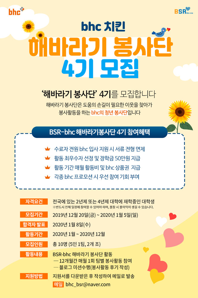 [시민일보 = 고수현 기자] 대한민국 대표 치킨 프랜차이즈 bhc치킨이 오는 2020년 '해바라기 봉사단'을 이끌어 나갈 4기 봉사단원을 모집한다고 20일 밝혔다.