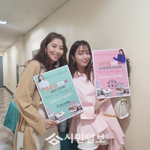 이번에 공개된 사진에는 KBS 2TV 주말드라마 '한 번 다녀왔습니다' 촬영장에 마련된 도시락 선물을 인증하고 있는 이민정, 오윤아의 모습이 담겨 훈훈함을 자아냈다.