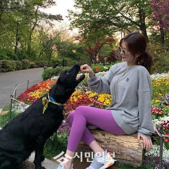 공개된 사진 속 정선아는 눈부신 미모를 뽐내며 보라색 레깅스에 회색 운동복을 입고 검은색 대형견과 함께 여유를 만끽하는 모습으로 눈길을 사로잡았다.