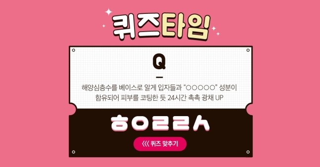 20일 버즈빌 퀴즈타임 이벤트에 “해양심층수를 베이스로 알게 입자들과 00000 성분이 함유되어 피부를 코팅한 듯 촉촉 광채 UP”이라는 문제가 출제됐다.