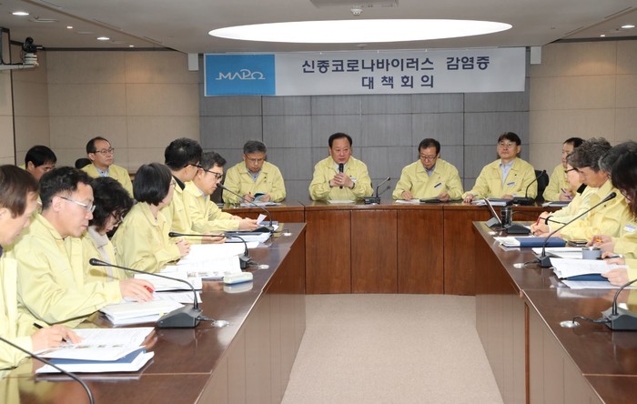 유동균 서울 마포구청장이 30일 신종코로나바이러스 감염증 발생과 관련해 구의 비상방역체계 유지상태를 재점검하고 환자 발생시 신속 대응하기 위해 관련 부서장들과 대책회의를 진행했다. 사진은 유 구청장이 회의를 주재하는 모습. (사진제공=마포구청)