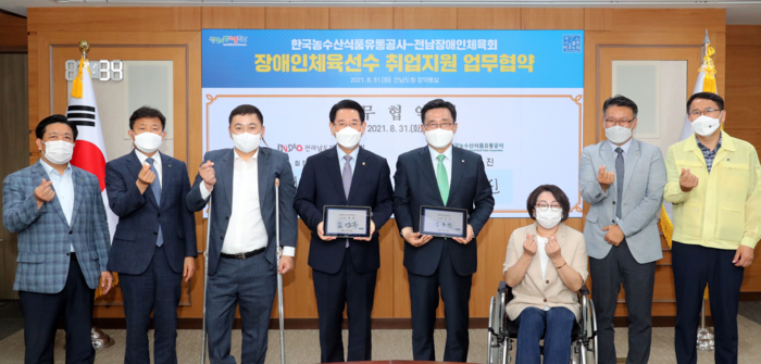 전라남도장애인체육회(회장 김영록 전남도지사)와 한국농수산식품유통공사(사장 김춘진)는 31일 도청에서 지역장애인 체육 발전과 생활 안정을 위해 장애인 체육선수 취업을 지원하는 업무협약을 했다.