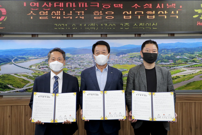 합천군(군수 문준희)은 9월 14일 합천군청에서 한국수자원공사(낙동강유역본부장 손병용), ㈜BXNK(대표 김기경)와 함께 영상테마파크 호텔 조정지댐 수열에너지 활용을 위한 업무협약을 체결했다.